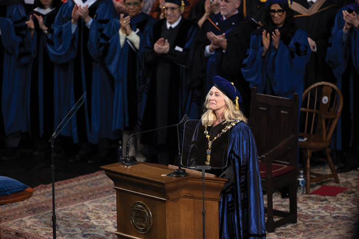 President McInnis delivers her inaugural remarks in Woolsey Hall.