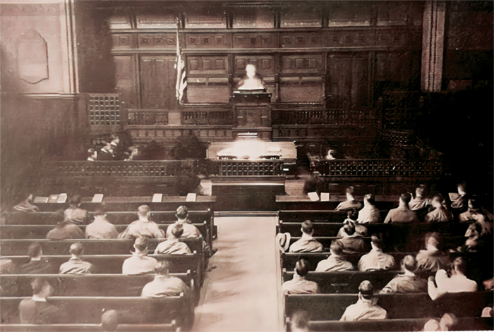 Students rebelled against their confinement—especially when preachers began to run long in their homilies—with a rash of coughs, sneezes, and shuffling of feet. Dogs, snakes, and roosters occasionally found their way into the chapel. One of the few things students enjoyed was “bowing out” the president as he left the chapel at the end of the service. Only seniors were afforded this honor; they lined up and bowed at the waist as the president passed through, making a game of seeing how close they could come to their leader without touching him.