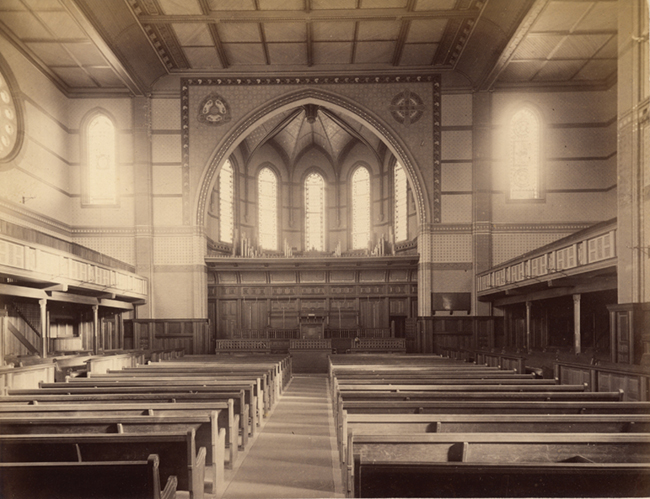 Battell Chapel was home to Yale’s daily chapel services from 1874 to 1931. After this photo was taken, it was expanded in 1894 to seat 400 more people.