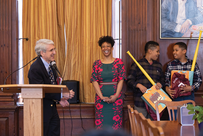In 2022, then-President Peter Salovey ’86PhD (left), announced Gonzalez’s appointment as head of Davenport College, with her twins Alex (second from right) and Jackson (right) in attendance.