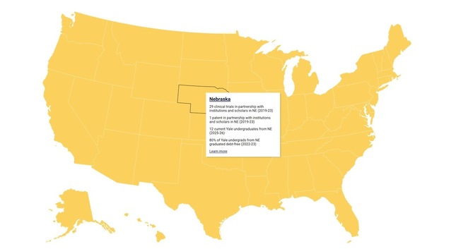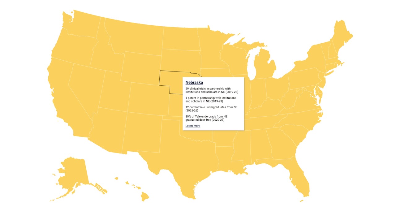 If you’re paying attention, you probably have a pretty good idea that Yale’s teaching, research, and innovation has an impact across the country and around the world. But what about, say, Nebraska—specifically? This spring, the university launched an interactive map that offers data on the number of Yale students from each state, the number of clinical trials done by Yale researchers with institutions and scholars in that state, and the number of patents granted to Yale researchers collaborating with institutions and scholars in that state. Find the map at yale.edu/about-yale/yales-impact-america/impact-state.