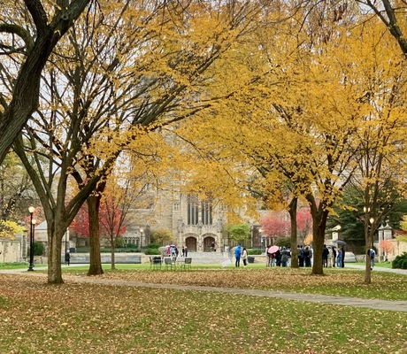 The fall foliage helped compensate for the fall drizzle as a tour group checked out Cross Campus yesterday.