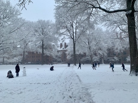 Today is the last day of finals, and most remaining students will soon be on their way home. As seen in this photo from Sunday morning, New Haven offered them one good snow before their departure.
