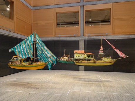 There are still a few days left to see the Center for British Art's retrospective on the work of Hew Locke, a Guyanese-British sculptor who has, in the museum's words, “used strategies of appropriation to reveal and upend the visual codes of imperialism.” The exhibition, which runs through this Sunday, includes these boats—one of Locke's favored motifs—installed in the center's entrance hall. |