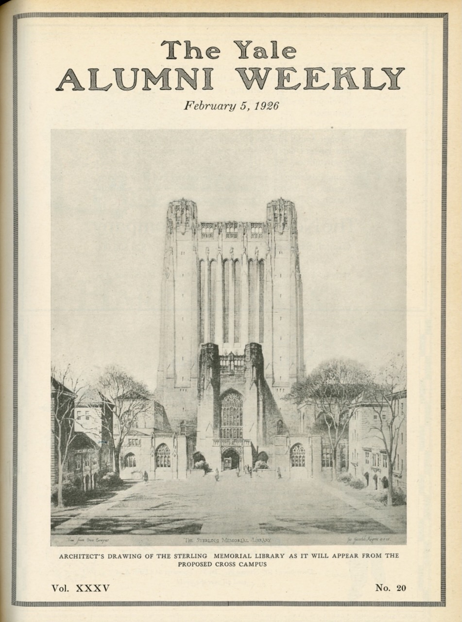On the cover of our February 5, 1926, issue, we revealed James Gamble Rogers's initial design for Sterling Memorial Library, reporting that its tower would be 192 feet tall and contain 22 floors of book stacks. The tower would end up being shorter, squatter, and sparer, topping out at 150 feet with 16 floors.