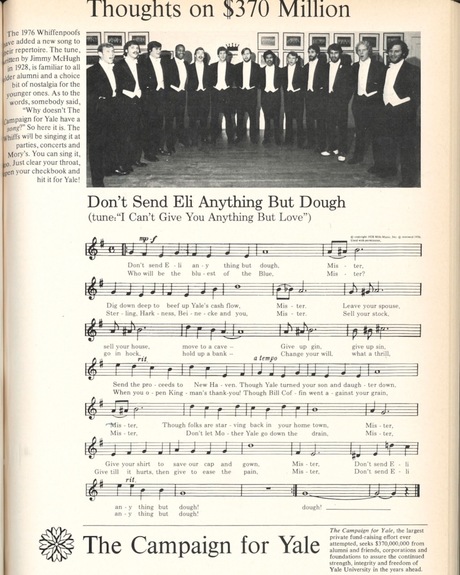 Fifty years ago, as today, Yale was in the midst of a capital campaign. In our February 1976 issue, we published the music and lyrics to a puckish campaign song advising alums to "sell your stock, go in hock, hold up a bank" for alma mater. It's not too late to propose a "For Humanity" song for the current campaign, which ends on June 30.