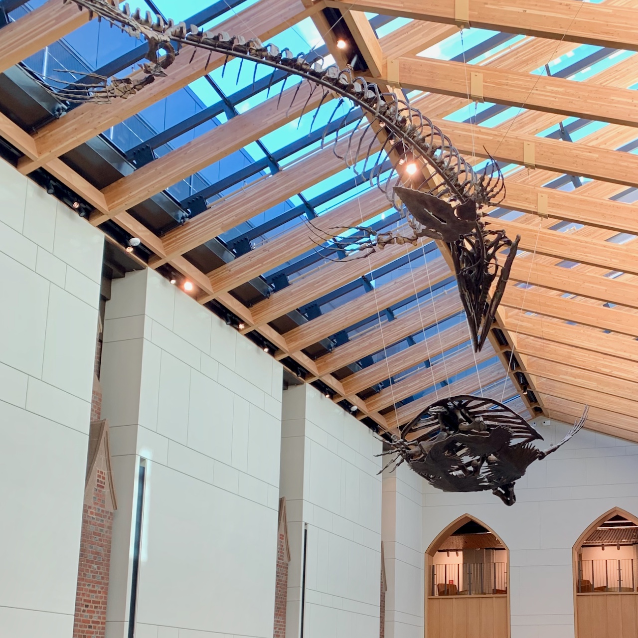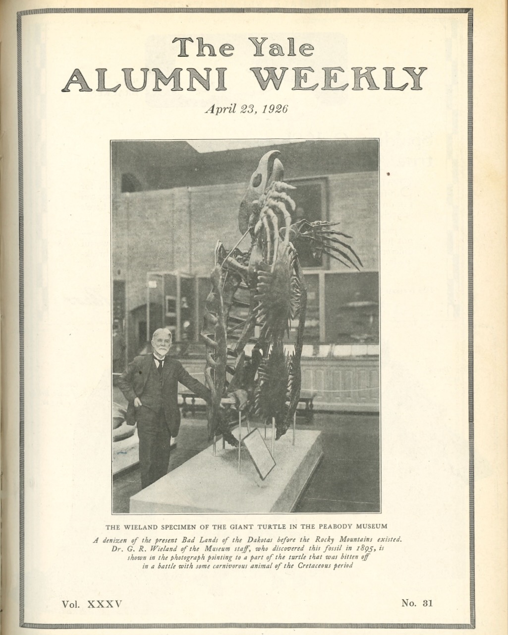 Our April 23, 1926 cover featured the fossilized skeleton of an Archelon—an ancient sea turtle—on display at the Peabody Museum, which had just opened four months earlier. The Archelon fossil is still a favorite 100 years later: the newly renovated Peabody features it suspended from the ceiling of the central gallery (second photo), pursued by a predatory Tylosaurus. The Archelon is missing its right rear flipper; the tableau suggests how that might have happened.